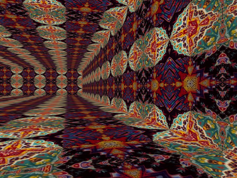Kaleider generates Kaleidoscopes, Mirrors, 3D Mirrors and Funnels automatically in random sequences. Configuration allows control of which effects are included and how often they are rendered. The Wandering Effects option adds motion to the graphics. The Rooms feature creates depth perspectives, optionally with automated Roaming movements. Mandala Mode shows patterns centered within a circle. Music can also accompany the visual effects.