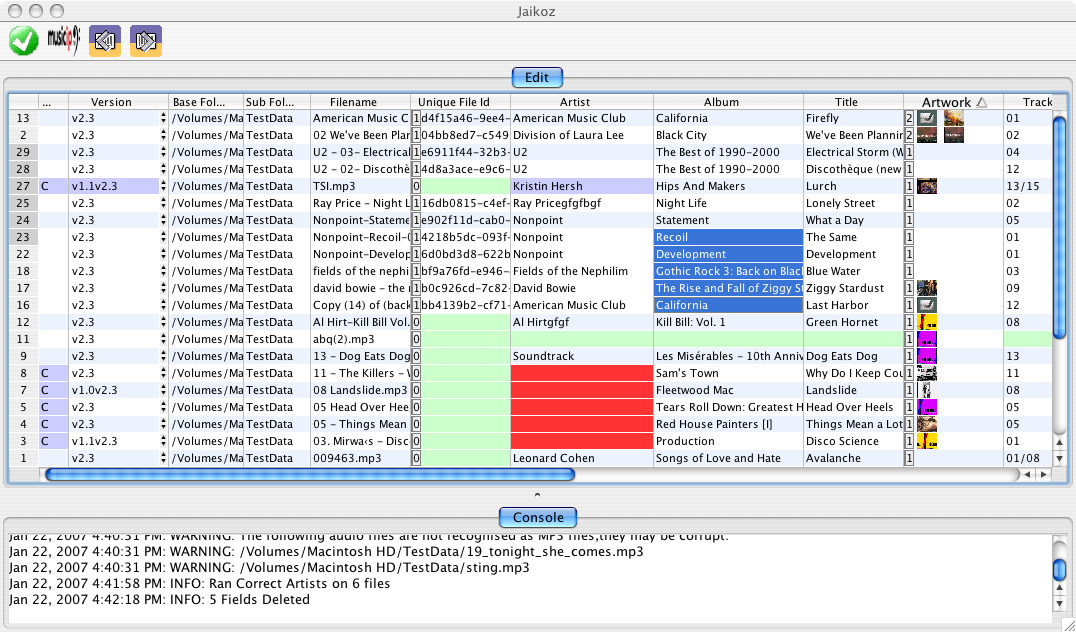 Jaikoz is an ID3 Tagger designed for dealing with large music collections. Specifically designed to allow tagging of large number of audio files Intelligent FileName to Tagger can extract information from the filename into the tag without having to know the format of the field Intelligent AutoMatch compares different Audio files and finds field matches and then allows all similar fields to be formatted the same. Intelligent AutoFormat provides automatic capitalization, conversion of special words and removal of invalid and punctuation characters. AutoCorrect can be used to perform automatic formatting of your chosen columns in a single click. The innovative split screen spreadsheet view allows easy editing of all fields. Provides full support of all text fields and partial support of all other fields. Automatically keeps v1 and v2 tags synchronised Full Unicode support allow any character from any language to be used. Easy conversion of tags between version. Displays what is actually contained in the tag allowing the user full control.